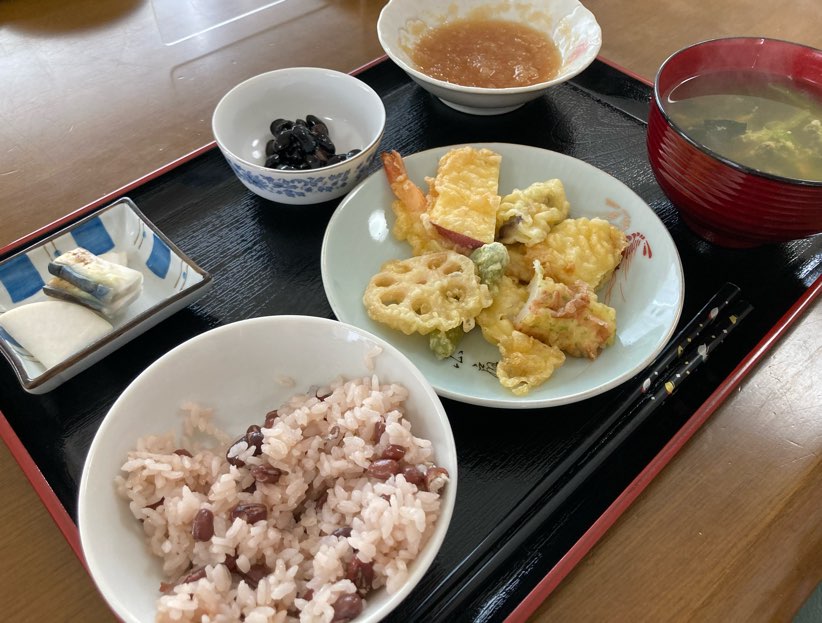お昼はお赤飯と天ぷらをお出ししました