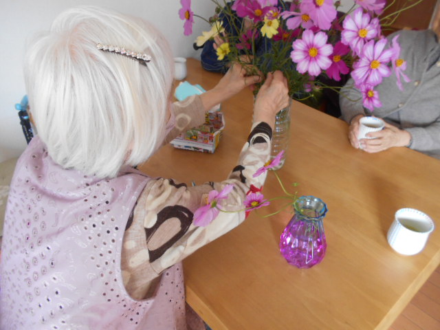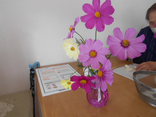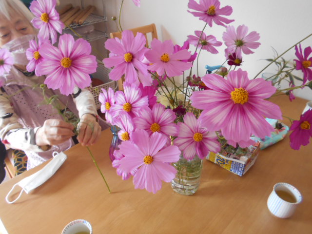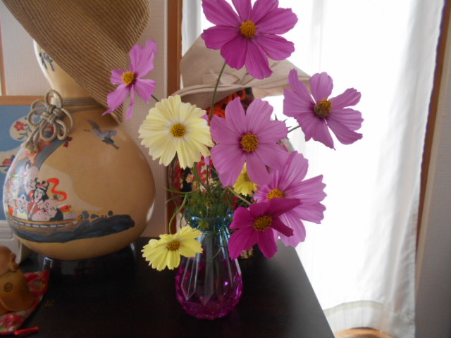 園芸の実習生さんが、「あわじ花さじき」のコスモスを持ってきてくれました。
