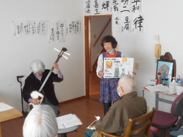 三味線から流れる名曲に合わせて歌います。