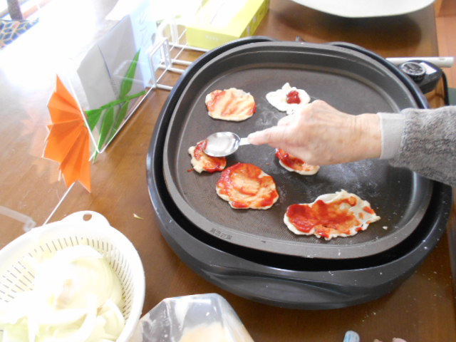 「お好み焼き?」と言いながら、ケチャップ塗ってくれました。